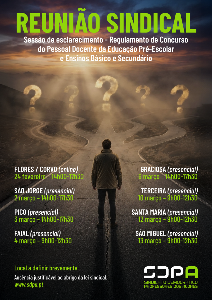O SDPA irá realizar reuniões sindicais, de caráter informativo, acerca do novo Regulamento de Concurso do Pessoal Docente da Educação Pré-Escolar e Ensinos Básico e Secundário.